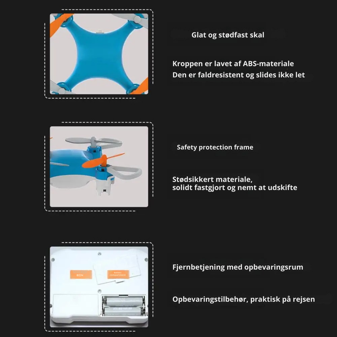 Propelbeskyttelsen gør AeroNøva perfekt til børn, fordi den kan flyves sikkert indendørs. Du giver en gave der både er sjov og tryg — præcis det forældre ønsker.